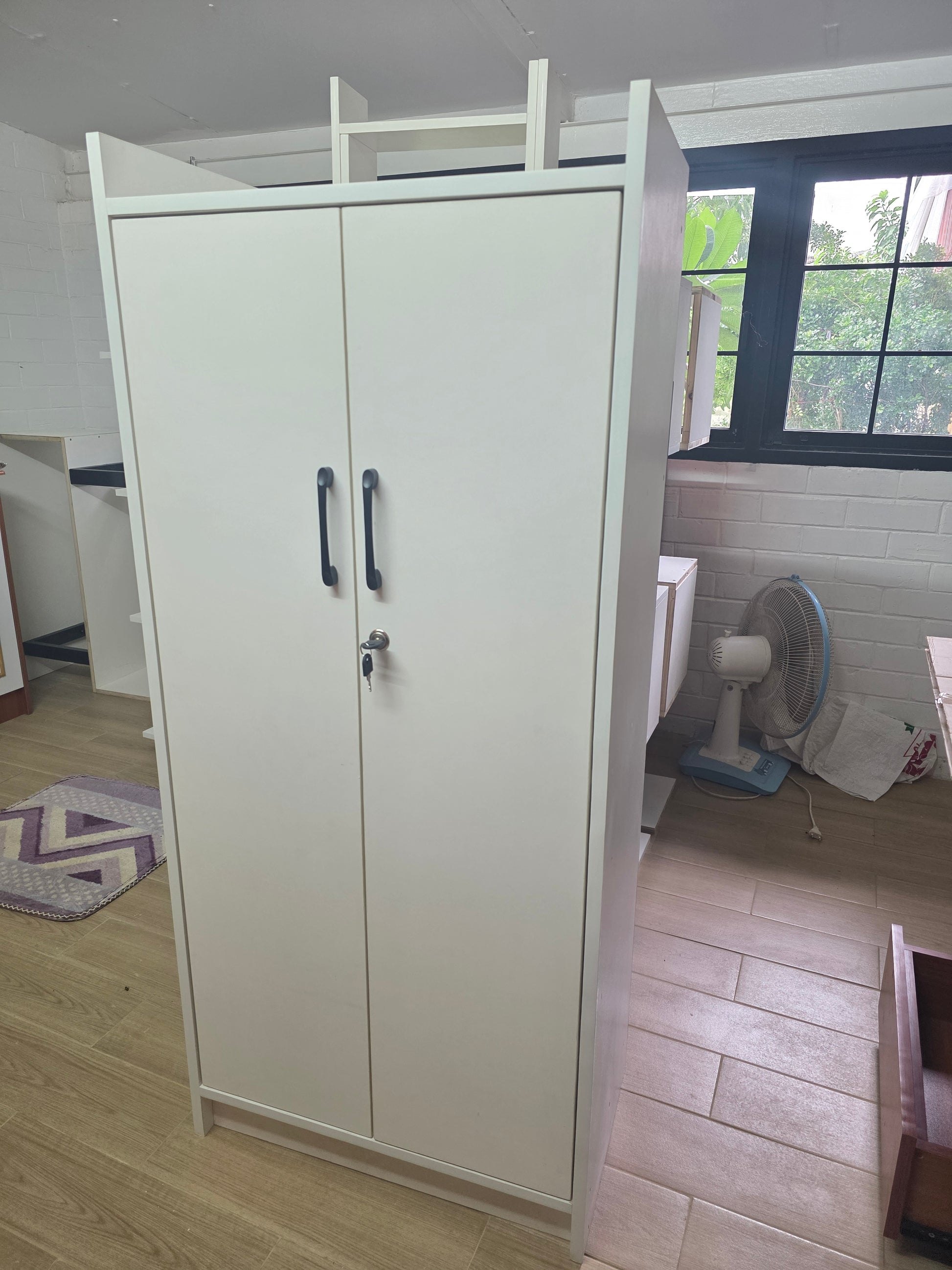 This white rubber blockboard wardrobe features a secure lockable door, providing safe storage for your belongings. Measuring 24 inches in length, 14 inches in width, and 54 inches in height, it offers ample vertical space while maintaining a compact footprint. Its durable construction ensures long-lasting use, making it an ideal choice for organized and secure storage in any room.